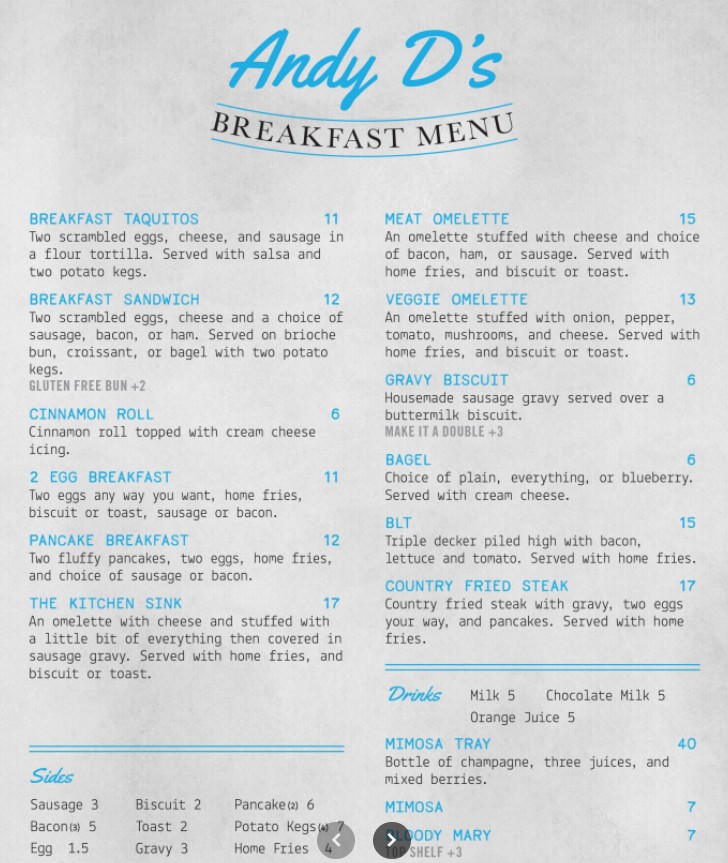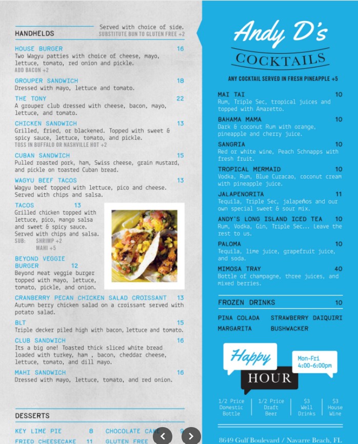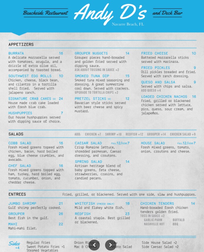 Welcome to Andy D’s Beachside Restaurant & Deck Bar, your go-to destination for relaxed oceanfront dining in Navarre Beach, Florida. Our Andy D’s Beachside Restaurant menu offers a delicious selection of fresh seafood, American favorites, handcrafted cocktails, and beachside breakfast options—all served with breathtaking views of the Gulf. Whether you’re stopping by for a casual lunch, sunset dinner, or drinks on the deck, Andy D’s delivers great food, friendly service, and an unforgettable beachside atmosphere.