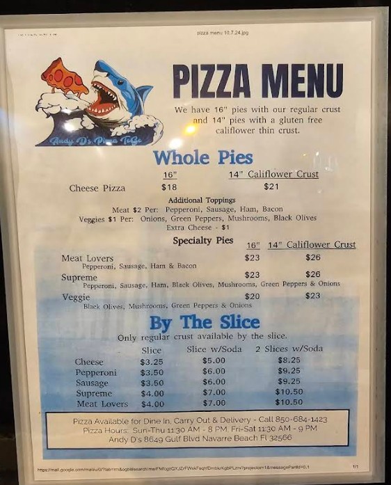 Arrived late to Navarre after a 9 hour drive and were famished. Heard Andy D's from the parking lot at our condo and decided it was the closest place to find dinner. We were pleasantly surprised. We were immediately inside by pleasant staff, our server was professional, polite and accommodating. We ordered nachos, shrimp taco and reddish. The nachos had all the toppings and loaded with cheese just the way we like them. The tacos were well seasoned and full of shrimp. The reddish has also seasoned and perfectly cooked on the grill. Also ordered a slice of key lime pie. The portions were reasonable and we were stuffed, ready to walk off our food along the beach afterwards. It was late, just before closing so there was a late night crowd, understably they were loud and obnoxious, leaving the dinning experience, well let's just say, you're at a beach side restraunt/bar and it's what is expected. I believe the staff spoke with the group because there was a time when they lowered their from shouting to using inside voices. The highlights of Andy D's are the staff and the keylime pie. The keylime pie was up in the top 5 of keylime pie I've tasted. It was really that good. Thanks Andy D's for the food. Good job.